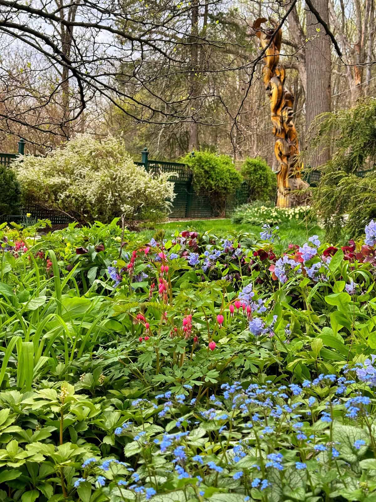 Mid spring plants such as brunnera, lungwort, epimedium, and bleeding hearts fill the space as early blooms decline. These plants vary in height and texture, which prevents the garden from feeling flat.