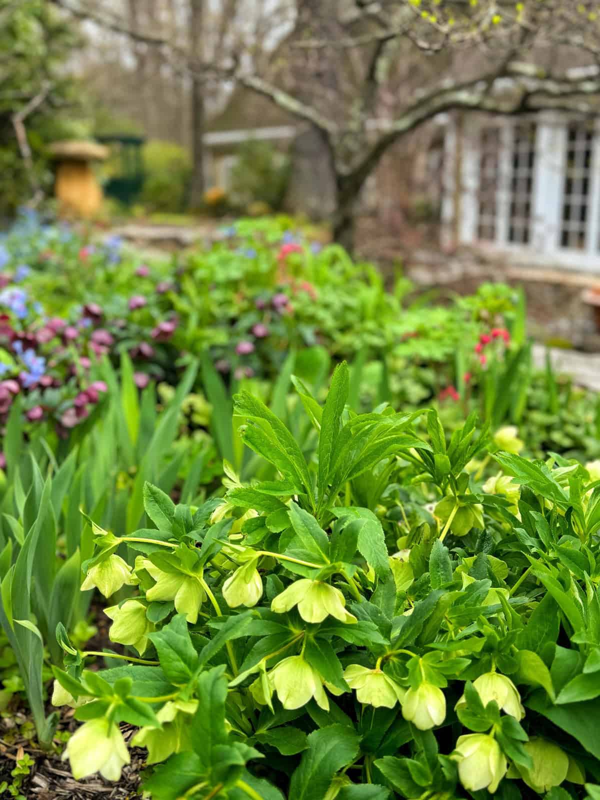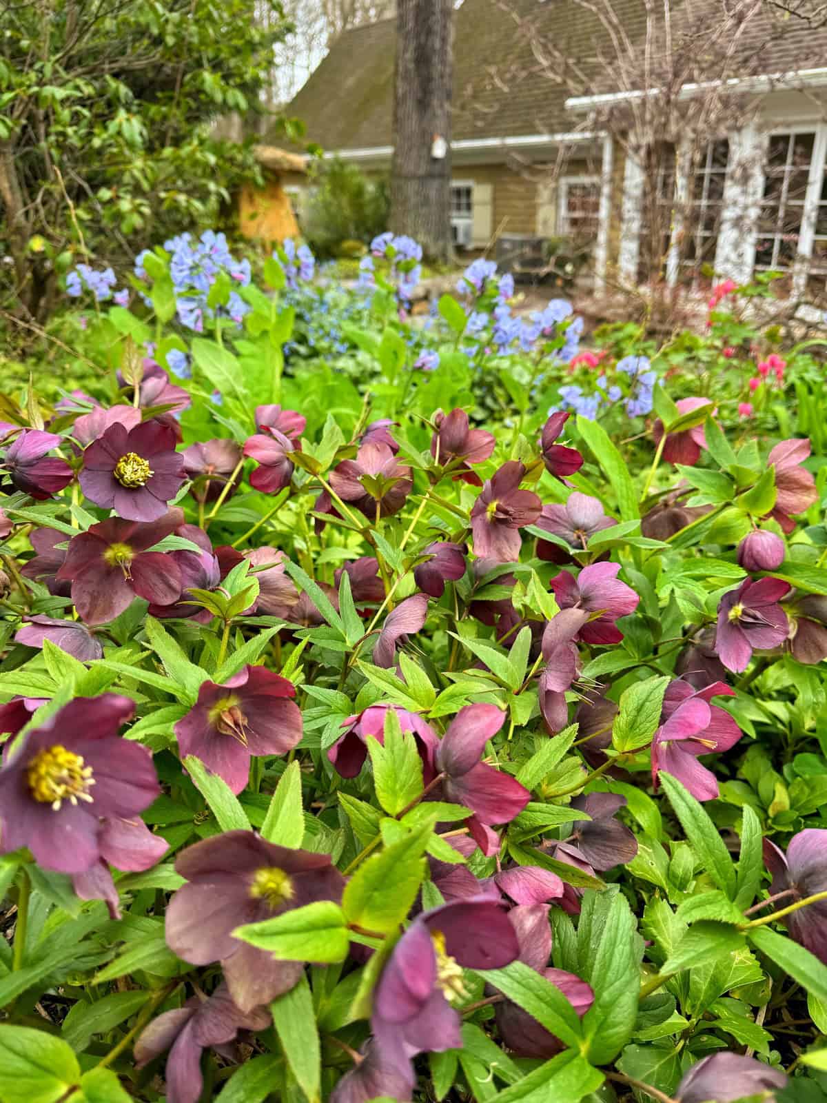 Around and slightly in front of the hellebores, I layer early bloomers like brunnera, lungwort, epimedium, and Virginia bluebells.